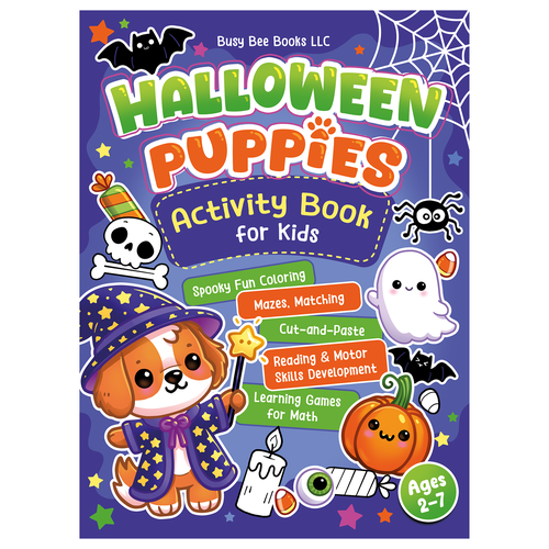 Fun friendly kids 2-7 year old oriented Halloween Coloring and Activity Book with a cute puppy theme